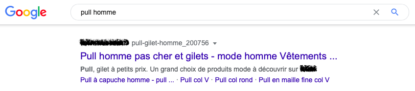 • Votre balise title doit contenir le mot clé principal de votre requête (ex : si votre requête est « pull homme », votre mot clé principal sera « pull homme »). Pour un meilleur résultat, votre expression clé devra être placée en début de titre.